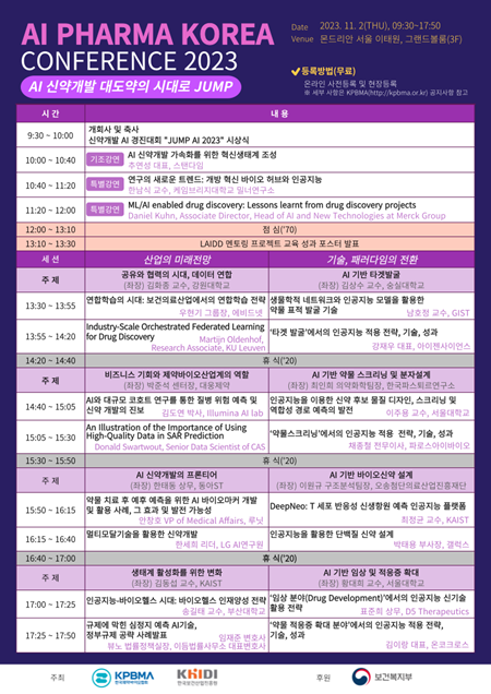 이번 컨퍼런스는 ‘AI 신약개발 대도약의 시대로 JUMP’라는 슬로건 아래, 국내외 유명 연사들의 강연과 다양한 주제의 세션을 통해 인공지능 신약개발의 현재와 미래를 조망하고, 산학연 네트워크와 협력을 강화하는 장이 될 것으로 기대된다.