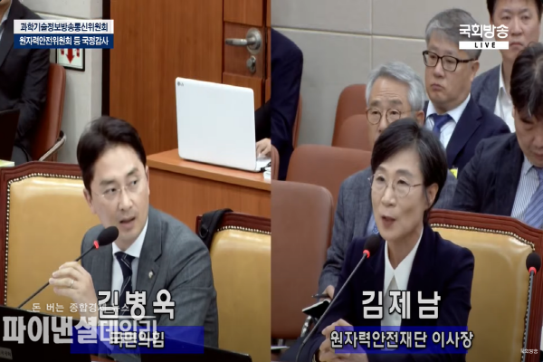 김 의원은 "김제남 이사장에게 원자력 관리 기관에서 돈 받아서 원전 반대하는 시민단체에 후원하는 사람, 후쿠시마 오염수 방류에 대한 IAEA 보고서를 개인적으로는 동의한다고 말하지 못하는 사람"이라며 "이런 인사가 원자력안전재단 이사장을 하는게 말이 안된다"고 질타했다.