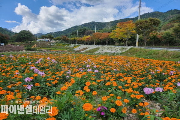 현재 대한리 꽃동산 일원에는 메리골드, 백일홍 등 초가을 제철꽃과 보라색으로 물든 아스타국화가 만개하여 다채로운 색감의 조화로 눈길을 끌고 있다.