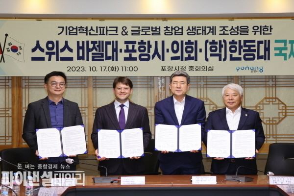 [파이낸셜데일리 박미화기자] 포항시와 포항시의회는 17일 스위스 바젤대학교 혁신센터 및 (학)한동대학교와 기업혁신파크 및 창업생태계 조성을 위한 업무협약을 맺고 글로벌 네트워크 구축에 나섰다고 밝혔다.