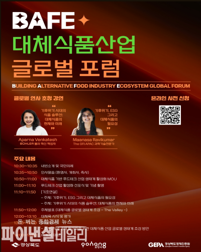 경상북도(도지사 이철우)는 11월 1일(수) 포항 포스코 체인지업그라운드 이벤트홀에서 「대체식품 산업 생태계 구축 글로벌 포럼(BAFE)*」 개최한다고 밝혔다.