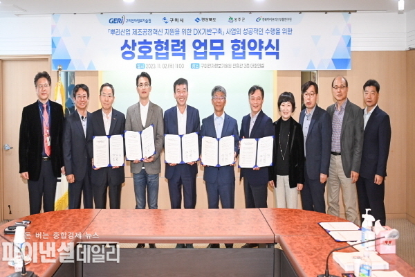[파이낸셜데일리 박미화 기자] 구미시는 2일 경상북도, 성주군, 구미전자정보기술원, 경북하이브리드부품연구원과 「뿌리산업 제조공정혁신 지원을 위한 DX 기반구축 사업」의 성공적인 추진을 위한 업무협약을 체결했다.