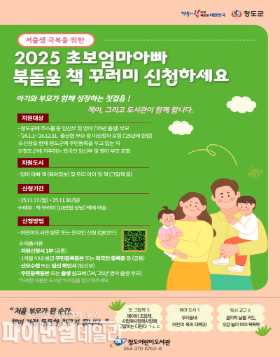 [파이낸셜데일리 박미화 기자] 청도군(군수 김하수)은 새롭게 부모가 된 가정의 건강한 육아 시작을 응원하기 위해 『2025 초보엄마아빠 북돋움 책선물 지원사업』을 추진한다고 13일 밝혔다.