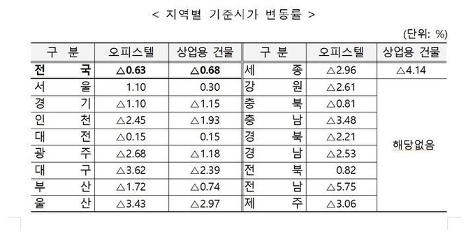 상업용 건물은 공급과다, 상권침체로 인한 공실률 증가로 세종(-4.14%), 울산(-2.97%) 등에서 하락했다. 서울(0.30%)은 강남 오피스 수요 증가, 재개발·재건축 기대감, 외국인 관광객 증가 등으로 소폭 상승했다.