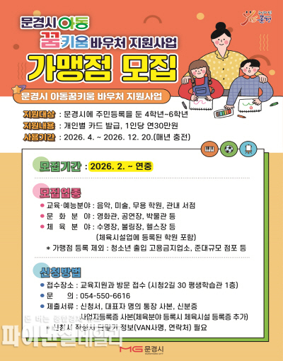 [파이낸셜데일리 박미화 기자] 문경시는 지역 아동의 건강한 성장과 다양한 체험 기회 제공을 위해 추진 중인 ‘아동꿈키움 바우처 지원사업’과 관련해 가맹점을 모집한다고 밝혔다.