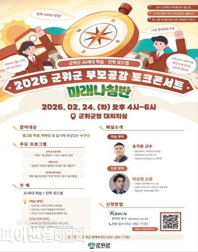 [파이낸셜데일리 박미화 기자] 대구시 군위군(군수 김진열)은 오는 24일 군청 대회의실에서 중ㆍ고등 학생, 학부모와 군위교육에 관심 있는 분들을 대상으로 ‘2026 군위군 부모공감 토크콘서트’를 진행한다고 밝혔다.