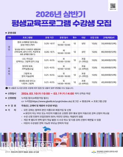 [파이낸셜데일리 박미화 기자] 경상북도교육청 금호도서관(관장 박경숙)은 양질이 평생교육을 통한 지역 주민의 삶의 질 향상에 기여하고자 ‘2026년 상반기 평생교육프로그램’을 개설하여 수강생을 모집한다.