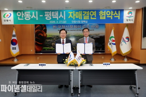 [파이낸셜데일리 박미화 기자] 안동시는 지난 27일(금) 안동시청에서 평택시(시장 정장선)와 자매결연 협약을 체결하고 경제․문화․관광‧농업 등 전 분야에 걸친 상생발전의 닻을 올렸다고 밝혔다.