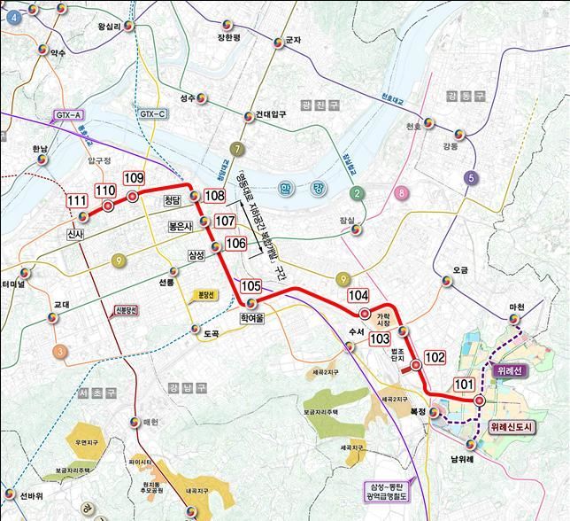 12월 개통 예정인 위례선 트램과의 연계를 통해 신도시와 서울 도심간 접근성을 향상시킨다. 위례중앙역과 신사역을 24분에 연결해 기존 대비 32분 단축한다.