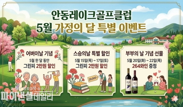 [파이낸셜데일리 박미화 기자] 경상북도문화관광공사(사장 김남일, 이하 공사) 안동레이크골프클럽은 5월 가정의 달을 맞아 1일부터 고객 감사의 마음을 전하기 위한 특별 할인 및 증정 이벤트를 실시한다고 밝혔다.