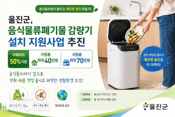 [파이낸셜데일리 박미화 기자] 울진군은 음식물쓰레기의 발생량 감소와 군민 생활환경 개선을 위해 ‘음식물류폐기물 감량기 설치 지원사업(3차)’을 오는 5월 22일까지 선착순으로 모집한다고 밝혔다.