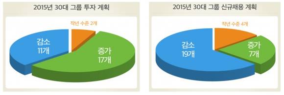 30대그룹 중 투자가 전년보다 증가하는 그룹은 17곳, 감소하는 그룹은 11곳, 전년수준은 2곳이다. 신규채용이 전년보다 증가하는 그룹은 7곳, 감소하는 그룹은 19곳, 작년수준은 4곳이다.