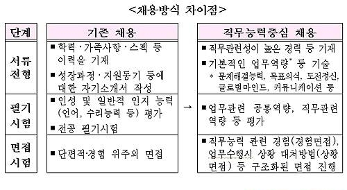 채용과정은 ▲채용기준(NCS 기반 직무기술서) 사전공개 ▲직무능력 기반 지원서 중심의 서류전형 ▲채용기준에 따른 직무능력평가(필기·면접 등)의 3단계에 걸쳐 구현된다.
