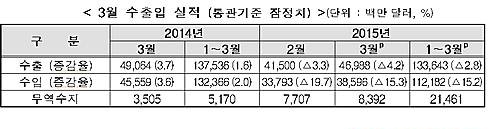유가하락에 따른 산유국의 구매력 감소 등의 여파로 3월중 수출이 470억 달러로 전년동월보다 4.2% 감소했다.