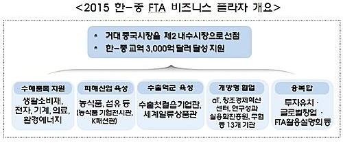 그 첫 조치로 aT와 코트라가 공동으로 오는 27~28일 최근 가서명한 한·중 FTA를 활용해 대중(對中) 수출붐을 조성하기 위해 일산 킨텍스와 대전·대구·광주에서 일대일 수출상담회인 '한·중FTA 비즈니스 플라자'를 공동개최한다.