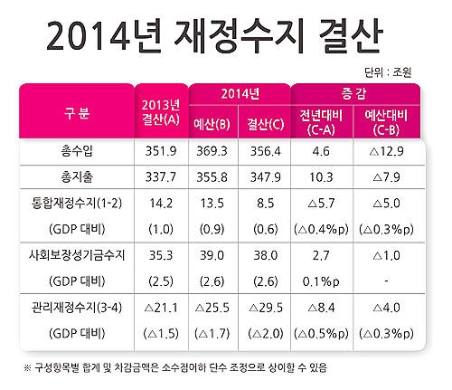 기재부는 "관리재정수지 적자와 국가채무 증가는 경기 활성화의 마중물 역할을 하기 위해 적극적으로 재정을 운용한 데서 비롯됐다"며 "2014년 국가결산 결과를 2016년 예산편성 등 앞으로의 재정 운용에 활용해 지출 효율성 제고 노력을 강화할 것"이라고 밝혔다.