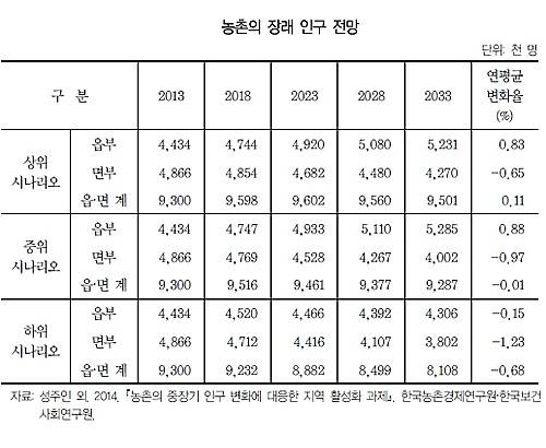 농경연은 가장 낙관적인 시나리오를 적용할 경우 농촌인구가 950만명에 달할 것이라고 밝혔다. 2023년 960만명까지 늘어 정점을 기록했다가 그 후 완만히 줄겠지만 연평균 0.11%의 증가율을 기록하며 2033년에도 2013년보다 많은 950만명 수준에 이를 것으로 전망됐다.