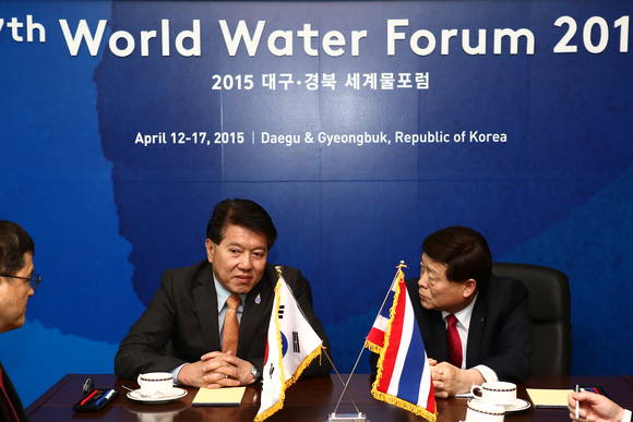 이상무 농어촌공사 사장(사진 오른쪽)은 12일 대구EXCO에서 열린 제7차 세계물포럼에 참석해 레트비로 코와타나(Lertviroj Kowattana) 태국 왕립관개청장(사진 왼쪽)과 씨송락 배수갑문 및 라마6댐 재개발사업 참여 방안을 논의했다.
