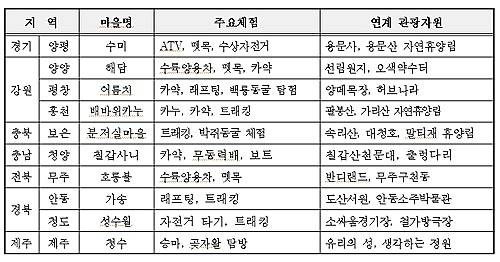 이들 마을은 지자체 및 체험마을 협의회와 여행전문가의 추천(지역별 2~5개소)을 받은 후 전문가 심사를 거쳐 최종 확정됐다.