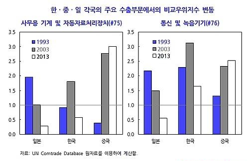 실제로 1993년 일본 사무용기계 및 자동자료처리장치 비교우위지수는 1993년 2.0을 나타냈으나 2003년 한국이 1.7, 중국이 2.7로 따라오자 2003년에는 1.0, 2013년에는 0.3으로 하락했다.