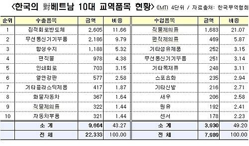 우리나라의 대 베트남 수출액은 지난해 223억달러로 143억달러의 무역수지 흑자를 기록했다.