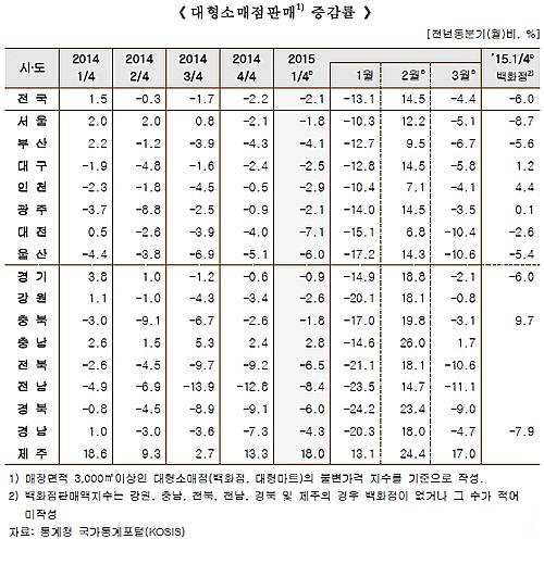 백화점의 경우도 상황은 비슷했다. 1분기 백화점 판매는 전국적으로 전년동기보다 6.0% 감소한 가운데 서울이 -8.7%, 경남이 -7.9%, 경기가 -6.0%를 각각 기록했다.
