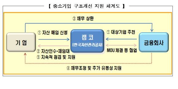 자산관리공사(캠코)가 일시적 위기를 맞은 중소기업의 정상화를 위해 자산매입 후 이를 임대해 주는 방안이 추진된다.