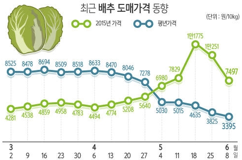 가뜩이나 올해 배추값은 지난해에 비해 천정부지로 뛴 상태다. 배추값은 5월 중순 1만2000원(10㎏ 기준)까지 올랐다가 정부의 수급 조절로 6000원대 중반까지 떨어져 안정되는 추세를 보였다.