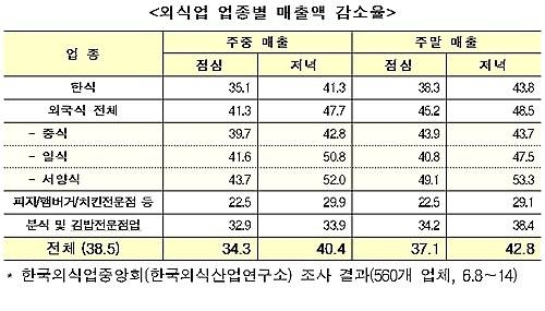 한식의 경우 주중 점심매출 감소율이 35.1%, 저녁 41.3%, 주말은 점심 38.3%, 저녁 43.8%에 달했다.
