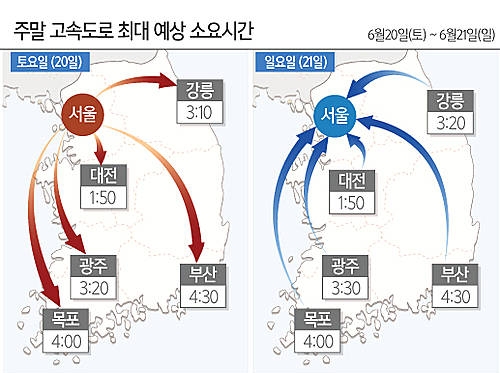 일요일 서울방향은 ▲대전~서울 1시간50분 ▲강릉~서울 3시간20분 ▲부산~서울 4시간30분 ▲광주~서울 3시간30분 ▲서서울~목포 4시간 등이다.