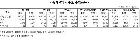 aT에 따르면 올들어 5월말기준 중미 6개국에서 수입한 바나나 수입액은 538만5000달러, 파인애플은 111만1000만달러에 달했다.