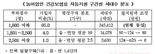 이번 제정안의 기준점수는 전년도 농어업인의 평균 건강보험료 부과점수와 보험료 부과점수별 가입자 비율을 고려했다.