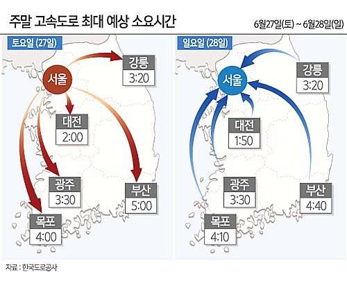 대도시 간의 예상 최대 소요시간은 토요일 지방 방향은 ▲서울~대전 2시간 ▲서울~강릉 3시간20분 ▲서울~부산 5시간 ▲서울~광주 3시간30분 ▲서서울~목포 4시간 등이다.
