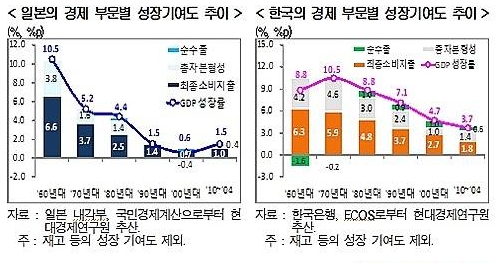 일본에서 소비의 성장기여도는 1960년대 6.6%포인트에서 1970년대 3.7%로 약 56% 수준으로 하락했다. 이후 1980년대 2%대였던 소비의 성장기여도가 1990년대 1%포인트대로 하락한 후 2000년대는 0%대까지 낮아진 상태다.