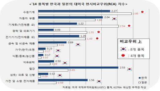 특히 일본과의 수출 경합도가 높은 자동차와 일반기계, 석유제품, 철강 등이 큰 타격을 받을 수 있을 것으로 우려된다. 반면 선박, 반도체, 무선통신기기 등의 경우 주력 품목 차이, 경쟁력 격차 등으로 큰 영향을 받지는 않을 것으로 보인다.