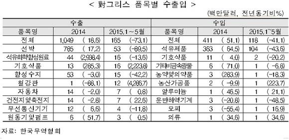 문제가 되는 그리스 수출은 5월까지 1억6482만달러에 달했다. 이는 전년동기보다 49%나 감소한 것이다.