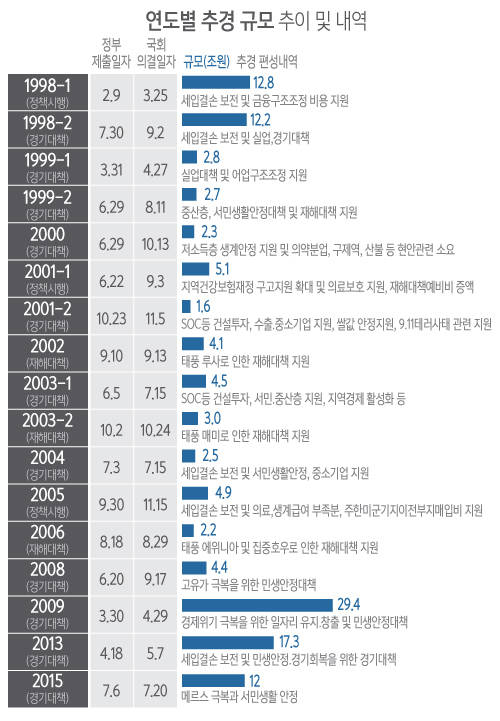 이번 추경은 외환위기 이후 편성된 추경 중 ▲금융위기 직후인 2009년 29조4000억원 ▲세입결손보전 및 경기회복을 위한 2013년 17조3000억원 ▲외환위기 직후 세입결손 보전 등을 위한 1998년 두 차례의 추경(각각 12조8000억원, 12조2000억원)에 이어 5번째 큰 규모다.