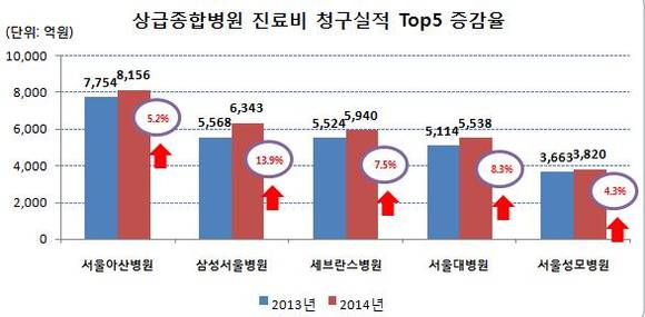 아산병원의 지난해 청구액은 2013년 대비 5.2% 증가한 8156억원이었다. 청구액 2위는 삼성서울병원(6343억원·13.0% ↑), 3위는 세브란스병원(5940억원·7.5% ↑), 4위는 서울대병원(5538억원·8.3% ↑), 5위는 서울성모병원(3820억원·4.3% ↑)순으로 나타났다.