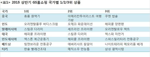 GS홈쇼핑은 9일 해외 홈쇼핑에서 판매된 한국 상품 판매액을 토대로 '2015년 상반기 글로벌 히트상품'을 집계한 결과, 한국 중소기업 상품이 판매량 상위에 대부분을 차지했다고 밝혔다.