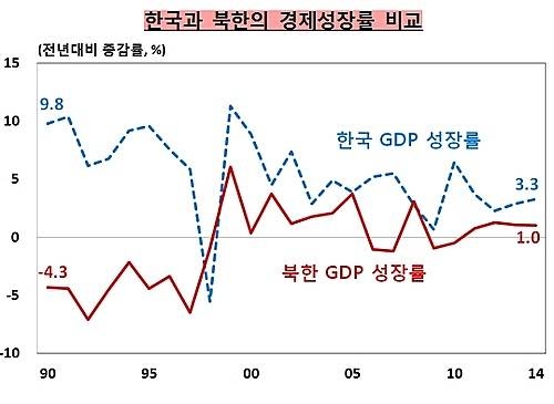 북한의 지난해 실질 국내총생산(GDP) 성장률은 1.0%로 추정됐다. 이로써 지난 2012년부터 3년째 1%대 성장률을 유지했다. 북한의 경제성장률은 지난 2011년 0.8%로 플러스로 돌아선 뒤 2012년 1.3%, 2013년 1.1%를 기록했다.