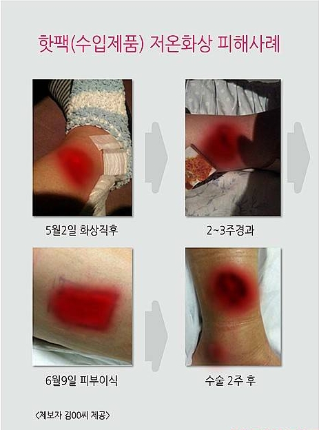 한국소비자원 관계자는 "40~70도 이하의 낮은 온도라 해도 핫팩을 오랜 시간 특정 부위에 직접 사용할 경우 저온화상 우려가 있다"며 "화상 피해 100건 중에는 병원 치료까지 받았을 정도로 심각한 사례가 많다"고 주의를 당부했다.