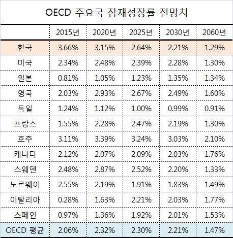 이 기간 동안 OECD 평균 잠재성장률은 2.06%에서 오히려 2.30%으로 오를 것으로 전망된다.