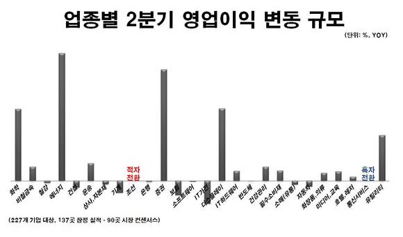 업종별로는 조선사들이 4조7449억원 규모로 적자를 이어가는 반면 통신서비스 기업들은 9741억원의 영업이익을 기록하며 흑자로 돌아설 것으로 예상된다.