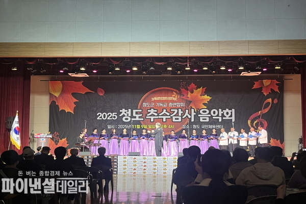 [파이낸셜데일리 박미화 기자] 청도군(군수 김하수) 국민체육센터 실내체육관에서 청도군기독교총연합회(회장 이판수)에서 주관한 '2025년 청도 추수감사음악회'가 지역 주민과 기관‧단체가 참여한 가운데 성황리에 개최됐다고 지난 13일 밝혔다.