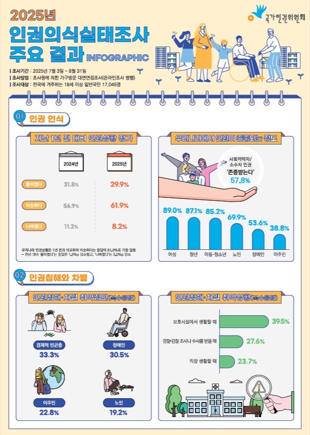 이 같은 설문조사 결과는 국가인권위원회(인권위)가 26일 오후 2시 서울 중구 포포인츠 바이 쉐라톤 조선 명동에서 개최하는 2025년 국가인권통계 분석 토론회에서 발표된다.