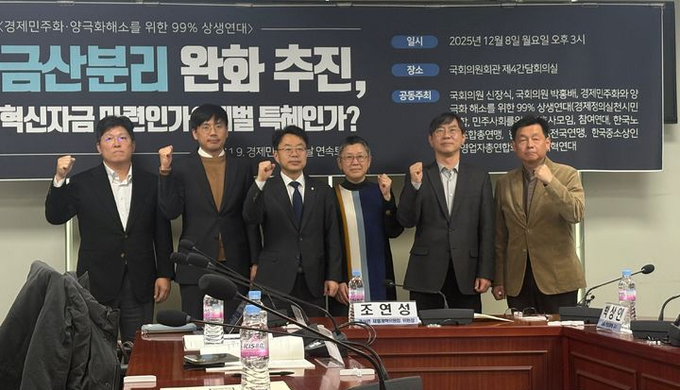 한국노동조합총연맹(한국노총), 경실련, 참여연대 등 6개 시민단체로 구성된 '경제민주화와 양극화 해소를 위한 99% 상생연대'는 8일 서울 영등포구 국회의원회관 제4간담회실에서 '금단분리 완화 추진, 혁신 자금 마련인가, 재벌 특혜인가' 연속 토론회를 열고 "정부가 AI 투자라는 명분으로 금산분리 원칙을 흔들고 있다"고 지적했다.
