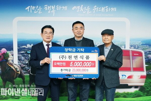 [파이낸셜데일리 박미화 기자] 영천시는 8일 ㈜천연식품에서 500만원, ㈜우진농업회사법인에서 500만원, 초록농산에서 100만원의 장학금을 영천시장학회에 기탁하며 지역사회에 훈훈한 온기를 더하고 있다고 밝혔다.