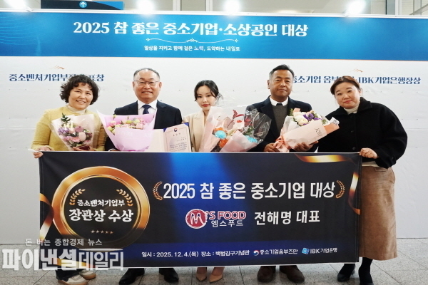 [파이낸셜데일리 박미화 기자] 엠스푸드㈜(대표 전해명) 대표가 지난 4일 백범김구기념관에서 열린 ‘2025 참 좋은 중소기업 대상’ 시상식에서 중소벤처기업부 장관상을 수상했다고 밝혔다.