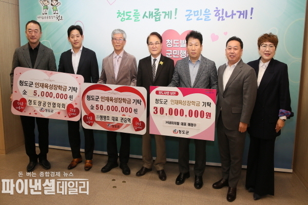 [파이낸셜데일리 박미화 기자] 청도군(군수 김하수)은 지난 15일(월) 청도상공인협의회와 회원들로부터 인재육성장학금 총 8,500만원을 기탁받았다고 밝혔다.