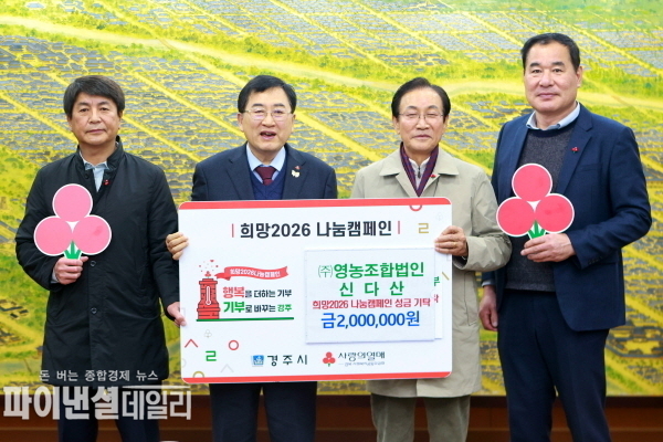 [파이낸셜데일리 박미화 기자] ㈜영농조합법인 신다산(대표 장동호)은 15일(월) 경주시청을 방문하여 희망2026나눔 캠페인 성금 2백만원과 장학금 3백만원을 기탁했다고 밝혔다.